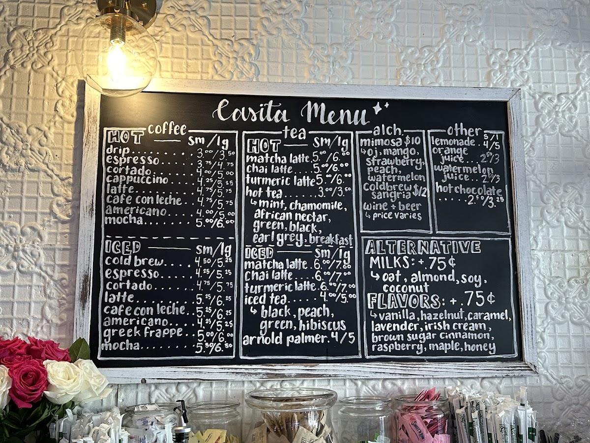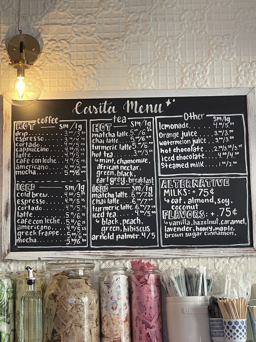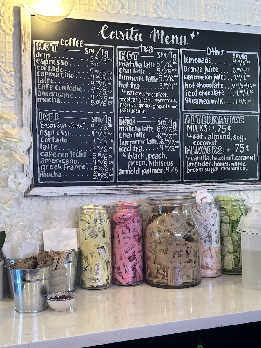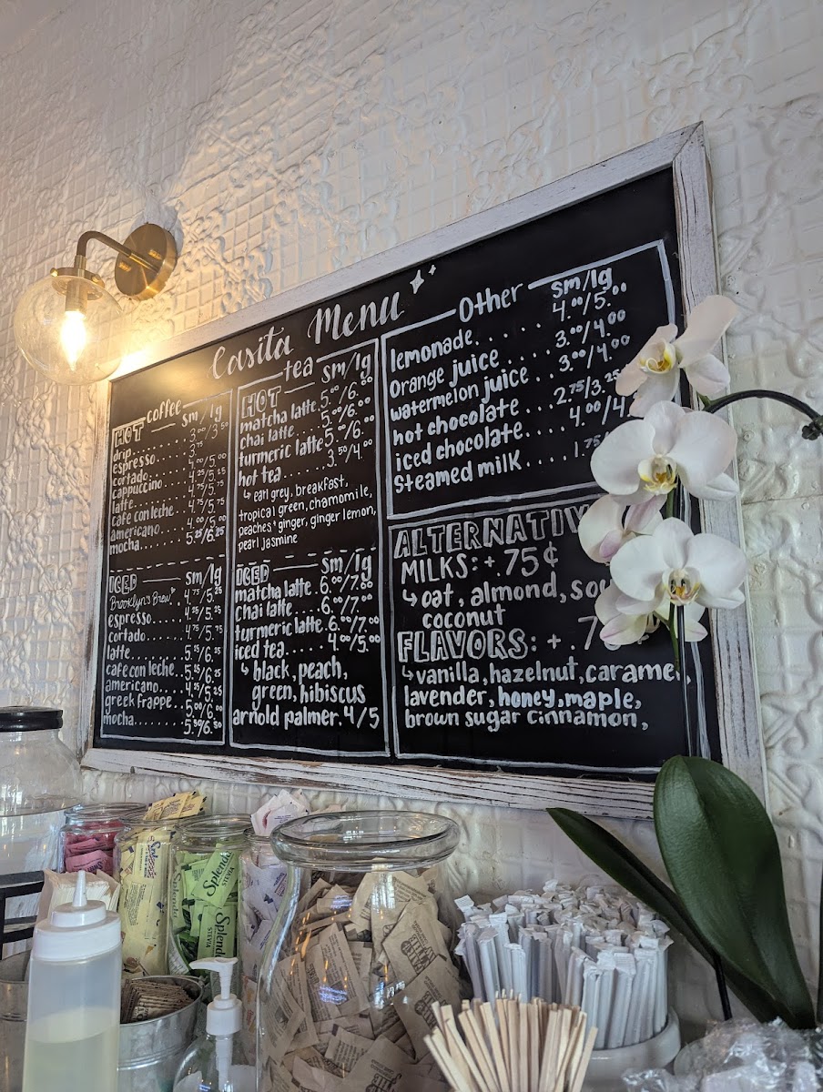 Non-coffee drinkers are not overlooked, with options like Chocolate Coffee, Iced Chocolate Coffee, Still Water, Sparkling Water, and Sparkling Lemon. Meanwhile, tea lovers can enjoy a strong range of Organic Iced Tea choices-Black Iced Tea, Iced Chai Latte, Iced Matcha Green Latte, Ginger Peach Iced Tea, and Wild Berry Hibiscus Iced Tea-as well as comforting Organic Hot Tea options such as Chai Latte, Matcha Green Latte, Turmeric Latte, Harney & Sons Ginger Peach Tea, and Harney & Sons English Breakfast. Finally, the Retail section, featuring the Casita Reusable Cup, Casita Tote Bag, Manhattan Blend Coffee 12oz, and Brooklyn Blend Coffee Bag, neatly rounds out the experience, allowing guests to take a piece of Casita home. Overall, the menu feels cohesive, warm, and intentional-an excellent reflection of the café’s inviting personality.